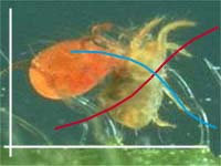Gesetzt den Fall, in einer Gewächshaus-Gurken-Plantage haben sich Spinnmilben bereits ungestört vermehrt. Sie sind dann die Beute der ausgesetzten Raubmilben, die sich nun ihrerseits zunächst ungestört ausbreiten können. Aber ihre Nahrung wird immer geringer, je mehr sie sich vermehren. Also kommt für die Raubmilben eine "Hungerzeit". ... Genau dies aber bedeutet dann für Spinnmilben, weil ihr Fressfeind reduziert ist, dass sie wieder zunehmen können, falls noch genügend Gurkenblätter da sind.