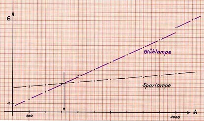 Rechnerisch ist die Sparlampe nach 312,925 h Brenndauer günstiger als die Glühlampe.