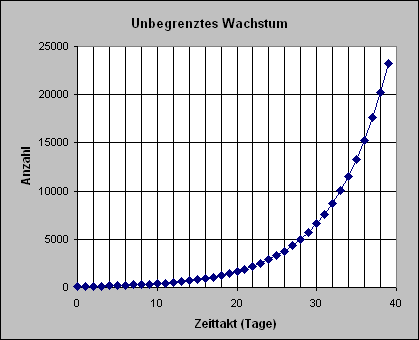 Die Spinnmilbenpopulation wächst in diesem Modell zunächst langsam, dann schneller. In immer kürzeren Zeitabständen verdoppelt sich die Anzahl der Spinnmilben. Und das kommt der Realität schon näher. Denn der stetig ansteigende Nachwuchs zeugt ebenfalls immer wieder Nachwuchs.