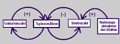 So zeigt das erste Wirkungsdiagramm, wie die Geburtenzahl der Spinnmilben positiv auf die Anzahl der Spinnmilben wirkt. Oder anders formuliert: Über die Geburtenzahl wächst die Spinnmilbenpopulation gleichförmig an.