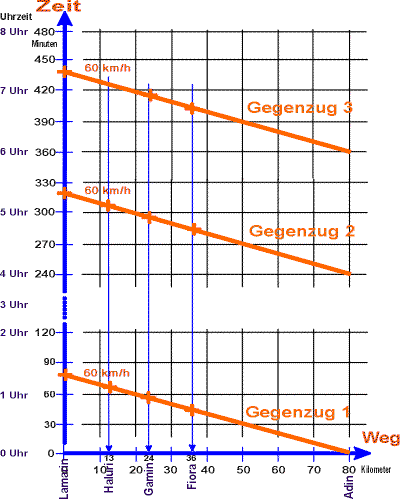 Das Besondere dieser Darstellung ist, dass die Zeit-Weg-Diagramme in dasselbe Koordinatensystem wie vorher von Lamarin nach Adin eingezeichnet werden können.