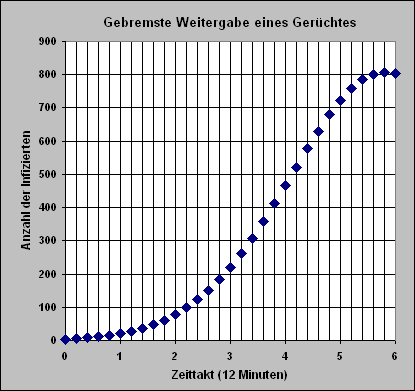 Später in einer erweiterten Modellierung kann dann auch noch betrachtet werden, wie die Zahl derer, die die Nachricht nicht weitergeben, ansteigt und dann negativ auf die Gesamtzahl der Informierten wirkt und so die Weitergabe eines Gerüchtes bremst. |