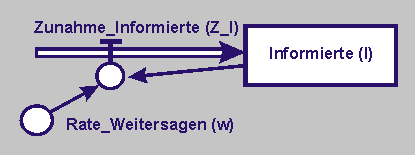 Die Zustandsgröße ist die Zahl der Informierten (I). Die Zunahme der Informierten (Z_I) ist die Flussgröße. Sie hängt sowohl von der Zahl der Informierten ab als auch davon ab, an wie viel Jugendliche die Informierten durchschnittlich jeweils die Nachricht weitersagen. Diese Zahl ist der Parameter (w); das ist die " Rate_Weiteragen". |