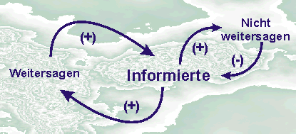In der Schule tuscheln einige Jugendliche miteinander: " Morgen gibt es schulfrei, hi,hi ...". Wer diese Nachricht das erste Mal hört, glaubt daran und gibt sie an Andere weiter. Die Nachricht verbreitet sich. Das Gerücht zieht von Klasse zu Klasse weiter. Und schließlich weiß niemand mehr, ob es wahr ist oder nicht. Sobald allerdings jemand die Nachricht ein zweites Mal hört, wird er stutzig und gibt das Gerücht nicht mehr weiter. |