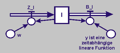 Die Zustandsgröße ist weiterhin die Zahl der Informierten (I). Neben der Zunahme der Informierten (Z_I) gibt es nun aber auch die Flussgröße der Bereits_Informierten (B_I). Beide Flussgrößen hängen von der Zahl der Informierten ab. Die Rate_Weitersagen w gibt an, an wie viel Jugendliche die Informierten durchschnittlich jeweils die Nachricht weitersagen. Aber die Zahl der Informierten wächst mit der Zeit immer langsamer. Denn immer mehr Jugendliche sind bereits_informiert und geben die Nachricht nicht mehr weiter. Diese Zahl der Bereits_Informierten, so wird hier angenommen, wächst also mit einer zeitabhängigen linearen Funktion y. |