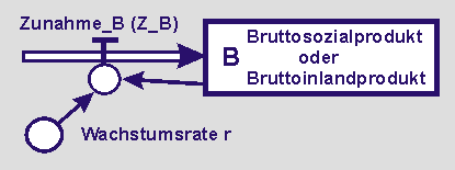 Die Zustandsgröße ist das BIP (B), die Flussgröße die Zunahme_B (Z_B) und der Parameter ist die Wachstumsrate r. In diesem Fall haben wir es also nur mit einem Zufluss zu tun.