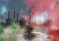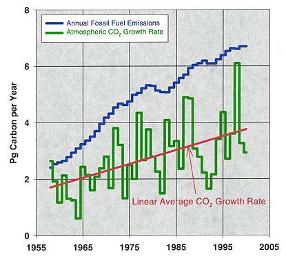 Annual average emissions of carbon dioxide to the atmosphere from global fossil fuel burning (blue histogram) and the increase in global carbon dioxide remaining in the atmosphere each year (green histogram), expressed in petagrams (billions of metric tons) of carbon. The straight red line represents an average linear growth rate of carbon dioxide in the atmosphere. |