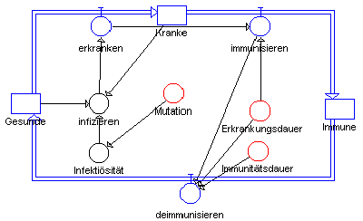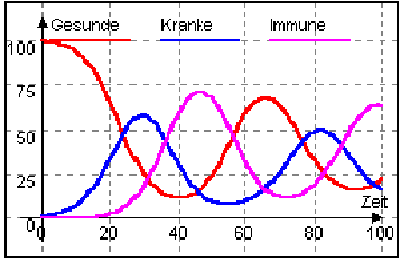 Bei einer Grippe ist ein wichtiger Gesichtspunkt das regelmäßige Aufflackern während des Verlaufs der Epidemie, bei der in Wellen ganze Gruppen einer Bevölkerung betroffen sein können. Die Ursachen für diesen wellenförmigen Verlauf können vielfältig sein. Das hier gewählte Modell beschränkt die Erklärung auf die Faktoren Erkankungs- und Immunitätsdauer sowie Infektiösität der Infektion.