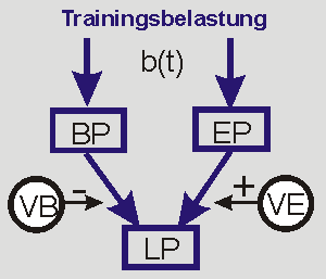 Zentral ist ein Leistungspotential LP(t), das über Flüsse in Abhängigkeit von einer Traingsbelastung b(t) verändert werden kann.