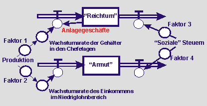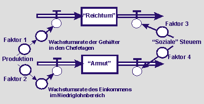Die beiden Zustandsgrößen "Reichtum" und "Armut" stehen über eine konstante Produktion, die unterschiedliche Wachstumsraten bei den Einkommen erzeugt und über unterschiedliche Steuern, miteinander in Wechselwirkung.