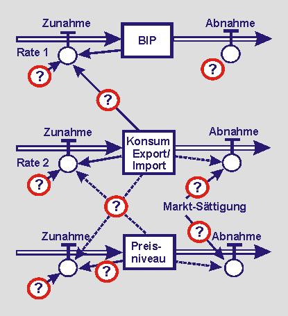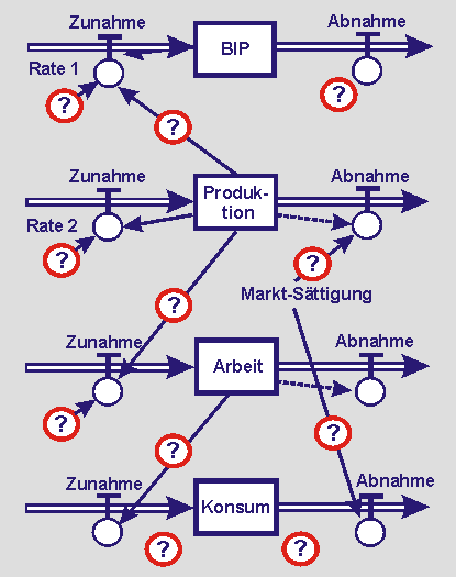 Zur Anregung werden in der Folge strukturelle Skizzen in Form eines Flussdiagramms angeboten. Sie müssen ggf. modifiziert und in jedem Fall noch mit Inhalt gefüllt und quantifiziert werden, ehe Zustands- und Modellgleichungen programmiert und simuliert werden können.