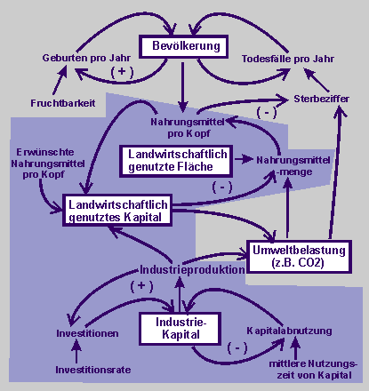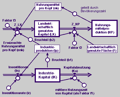 Struktur von Regelkreisen: Ein Teil des durch Industriekapital entstehenden Produkts ist landwirtschaftliches Kapital (Traktoren, Bewässerungsanlagen und Düngemittel). Die Größen des landwirtschaftlichen Kapitals und der kultivierten Landfläche beeinflussen erheblich die Menge der erzeugten Nahrungsmittel.