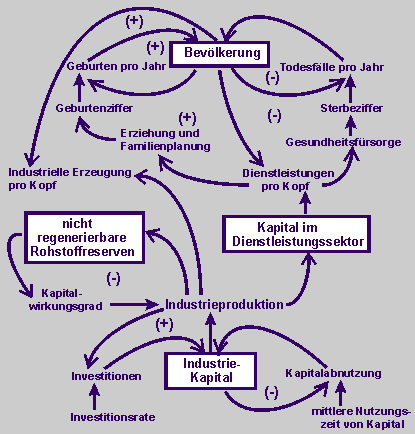 Wirkungsdiagramm der komplexeren dynamischen Struktur von Bevölkerung, Kapital, Dienstleistungen und Rohstoffen