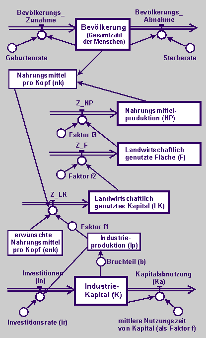 Aus dem komplexen Wirkungsgefüge von "Bevölkerung, Kapital, Landwirtschaft und Umweltverschmutzung" (siehe Wirkungsdiagramme auf der Seite ma7655.htm#Untersuchung) werden nun die getrennten Subsysteme zum Bevölkerungswachstum, zur Nahrungsproduktion und zum Kapitaleinsatz in einen Wirkungsdiagramm und dann in folgendem Flussdiagramm vereint. |