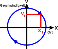Diese konkreten Wertepaare von Ort und Geschwindigkeit lassen sich als Punkte in einer Ebene mit den Koordinaten-Achsen Ort und Geschwindigkeit aufzeichnen (oben rechts).