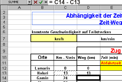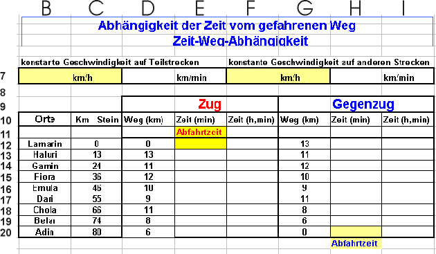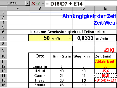 In einer Excel-Tabelle sollen die Ankunftszeiten eines Zuges und seines Gegenzuges in Abhängigkeit vom Weg (unter der Annahme einer konstanten Geschwindigkeit von 50km/h) sowie von der Abfahrtszeit am Ausgangsbahnhof berechnet werden.