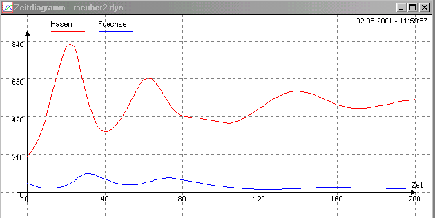 Beschreibung: Die in einem begrenzten Gebiet vorhandene Weide lässt den Bestand der Beute bis an die Grenze der Weidekapazität wachsen. Räuber verringern jedoch den Beutebestand entsprechend der Häufigkeit des Zusammentreffens zwischen Räuber und Beute, die von dem Bestand beider Populationen abhängt. Ohne Energiezufuhr durch Beutetiere verhungert der Räuberbestand."