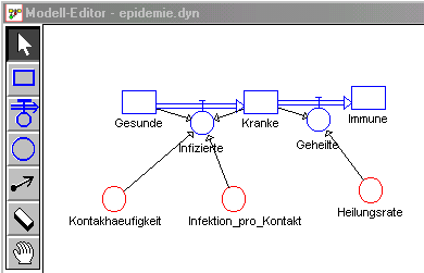 Mit der Funktion Bearbeiten könnt ihr in das noch leere Modell die Startwerte eingegeben und die Laufzeiten der Berechnung festgelegen. Dann kann simuliert werden.