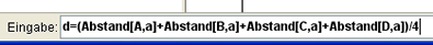 Dazu legen wir fest, dass der mittlere Abstand aller Punkte von der Ausgleichsgerade möglichst klein sein soll. Um den mittleren Abstand zu berechnen, gibt man die folgende Formel in die Eingabezeile ein. Dabei ist a der Name der Gerade (das muss ggf. angepasst werden: