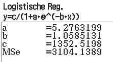 Der Rechner ermittelt nun eine logistische Funktion, die möglichst wenig von den gewählten Punkten abweicht. Hier die berechneten Funktionsparameter: