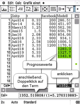 Dann klicken wir auf das Feld am Fuß der Wertetabelle unserer Modellfunktion und anschließend zweimal auf den Term hinter Cal=. Die Wertetabelle wird neu berechnet und zwar auch für die neuen t-Werte. |