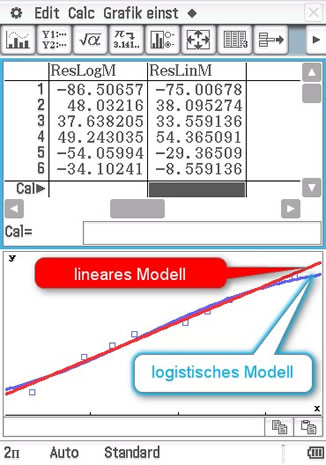 In der nebenstehenden Tabelle sind diese Abweichungen (Residuen) sowohl für das logistische Modell (ResLogM) als auch für das lineare Modell (ResLinM) aufgelistet. |