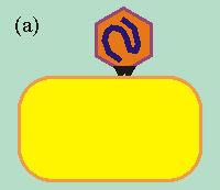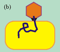 an (a), schleust sein Erbmaterial in die Wirtszelle ein (b)