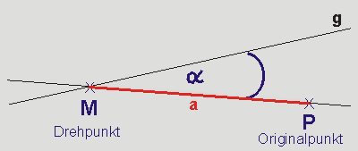 Gegeben sind die Gerade MP mit dem Drehpunkt M und dem Punkt P und ein Winkel α, der an MP in M angelegt ist.