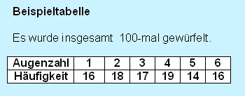Hier sind 16, 18, 17, 19, 14, 16 die absolute Häufigkeit für die Augenzahlen von 1 bis 6 bei einer Gesamtzahl von 100 Würfen.