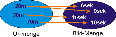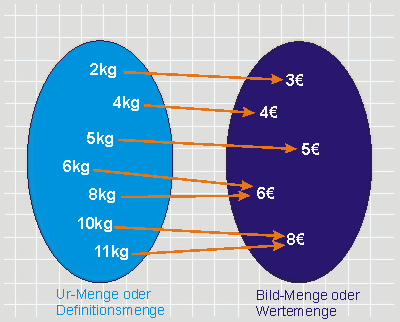 Eine Funktion ist eine Zuordnung, bei der jedem Element der Urmenge (oder Definitionsmenge, Definitionsbereich) genau ein Element der Bildmenge (oder Wertemenge) zugeordnet ist. Die vorstehenden Abbildungen zeigen die Darstellung und Veranschaulichung einer Funktion. Bei einer Funktion können Elemente aus der Bildmenge doppelt oder gar mehrfach vorkommen.
