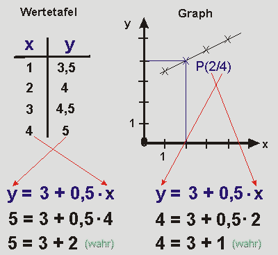 Wird etwa die x-Koordinate 2 in x und die y-Koordinate 4 in y eingesetzt, so entsteht die Aussage 4 = 3 + 1. Sie ist ebenfalls wahr. Also ist das Zahlenpaar (2/4) eine Lösung der Funktion. Der Punkt (2/4) liegt auf dem Graphen der Funktion.