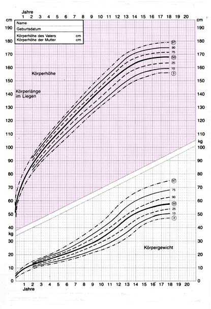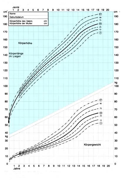 Bei konsequentem Messen kann man auch schon erste Vorhersagen bezüglich des zu erwartenden Endgewichtes wagen. Jedes Kind wächst nämlich auf seiner "eigenen Kurve": Ist z.B. ein Junge mit 6 Jahren 22 kg und mit 9 Jahren 30 kg schwer, dann wird er bei einer gesunden Entwicklung wahrscheinlich eine Erwachsenengewicht von ca. 68kg haben.