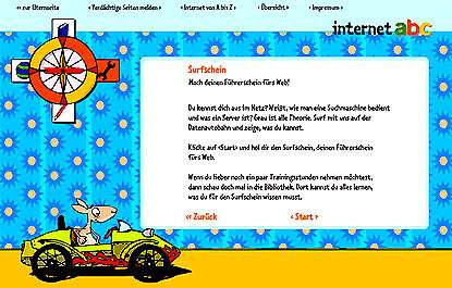 Einige bewertende Anmerkungen zum Erwerb eines Surfscheines Klickt man in der Übersicht oder bei Jumpy auf "Surfschein", dann erhält man die nebenstehende Seite. Nach Klicken auf "Start" fährt Jumpy mit seinem Auto ab. Mit einer hocherhobenen Fahne LOS fährt er bis zu einem Verkehrsschild, auf dem eine Etappen-Wahl zu treffen ist. |