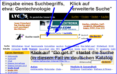 Ausschnitt des obersten Teils der einfachen Eingabemaske von Lycos.de Eine Suche in vorsortierten "Katalogen" wie "Autos", Medizin & Gesundheit" und viele weitere ist möglich. Anklicken von "Erweiterte Suche" führt zu einer Eingabemaske für Fortgeschrittene. Sehen Sie sich diese Maske bitte direkt im Internet an. Natürlich kann mit Lycos.de nicht nur in deutschen, sondern auch im gesamten Internet, im Bilderkatalog, im Bücherkatalog, ... recherchieret werden. Aber die meisten Suchoptionen in dieser Maske für Fortgeschrittene erklären sich selbst. Klickt man unter Hilfe auf "Suchsprache", so erhält man einen ausführlichen Text darüber, wie man die boolschen Operatoren AND, OR und NOT sowie die Anführungsstriche zur Bildung von Suchstrings bzw. Suchphrasen verwenden und Wortzusammenhänge mit ADJ, NEAR, FAR und BEFORE bilden kann. Diesen Text (3 DIN A4 Seiten) sollte man sich unbedingt ausdrucken, um ihn als Nachschlagewerk weiterhin nutzen zu können. Die AND-Suche