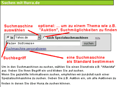 | HURRA ist der große Recherchedienst für jeden und alles im Internet. Hurra.de bündelt die WWW-Suchmöglichkeiten und stellt diese an einem Ort zur Verfügung. Stellen Sie sich Hurra wie eine Fernbedienung vor, mit der Sie schneller Dinge finden, die Sie suchen. ... Mit Hurra.de können Sie schnell und einfach zwischen diesen WWW-Suchmöglichkeiten wechseln und übergreifend suchen", so schreibt Hurra über sich selbst. | ||||