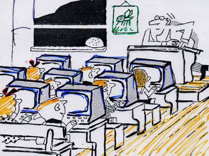 Ist nebenstehende Karikatur bereits Vergangenheit? Oder wird in Computerräumen immer noch zentral regiert? Ist Lernen an isolierten, "kleingekochten" Einzelhappen zu orientieren? Ist ein ausschließliches Lernen in Stufen und Einzelschritten nach heutigen Erkenntnissen noch adäquat? |