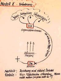 Auch hier gibt es eine Botschaft vom Ich zum Du. Dieses reagiert aber nicht mehr auf die Erwartungshaltung. Es wird nicht mehr gefragt: Was will der andere denn hören? Was muss ich sagen / tun, damit ich ihn nicht verletze, damit er nicht beleidigt ist? Auf der anderen Seite ist es aber auch nicht möglich, unbedenklich und uneingeschränkt, offen zu sein, denn das hieße, die Bedürfnisse des Ichs vollkommen zu übergehen. Das Du muss wohl jedes Mal neu überlegen, wie viel die Beziehung aushält, wie viel Offenheit sie verträgt. Leichter abzuschätzen ist dies, wenn gleichzeitig vom Ich die Botschaft ausgeht: Ich will etwas lernen. Dann sind die Grundvoraussetzungen geschaffen für ein Gespräch, das nach Modell 2 ablaufen wird. Dabei bedient sich das Du sogenannter Präzisionsfragen. Solche Fragen sind nicht liebevoll, schmeicheln dem anderen also nicht, bringen ihn unter Umständen auch in Bedrängnis, zielen aber andererseits auf die Sache selbst, nicht auf die persönliche Ebene. Durch Präzisionsfragen wird die Ebene des Persönlichen verlassen, man gelangt auf die Sachebene, dorthin, wo halbwegs sicheres Wissen zu erlangen ist. Modell 1 steht für Erhaltung und Stabilität; Modell 2 für Veränderung und Innovation. Das Verhältnis zwischen den beiden Polen muss von jeder Organisation selbst immer wieder neu bestimmt werden. Schulen haben relativ hohe Erhaltungswerte, was bedeutet, dass Modell 1 gut etabliert ist. Firmen wie z.B. Microsoft haben ein hohes Veränderungsmaß. Tatsache ist aber, dass in den meisten Organisationen nach Modell 1 kommuniziert wird, was oft bedeutet, dass für diese Organisationen Lernen nur sehr beschränkt möglich ist. Letztlich gilt, dass Systeme sich nur selbst helfen / heilen können. Der Berater von außen, der Experte von außen kann die Probleme eines Systems nicht lösen. Von außen kann die Heilung nicht kommen. Wie sind Präzisionsfragen? Offen: Was tust du, wenn... Welche Möglichkeiten hast du.. Womit würdest du beginnen? Geschlossen: Hast du...? Wer? Wo? Wann? Wie? Weshalb? | |||