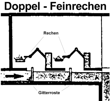 In diesem Becken werden die Abwässer mechanisch durch zwei Gitterroste und zwei Doppel-Feinrechen von gröberen Stücken befreit: