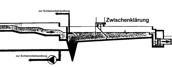 In einem ruhigen Becken setzen sich weitere Schmutzstoffe auf dem Boden ab. Der Schlamm wird abgezogen und dem Beginn der Klärung wieder zugeführt.