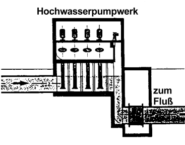 | Das Hochwasserpumpwerk pumpt das Wasser hier in einen Fluss.