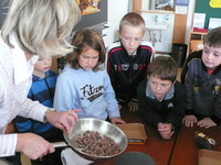 | Im Rahmen des Projektes "Wir reisen um die Welt" arbeiteten wir mit dem Schokokoffer. Eine Referentin der OEW besuchte uns am 12.11.2009. An diesem Vormittag erfuhren wir viel Interessantes über den Kakaoanbau und den fairen Handel. Den krönenden Abschluss bildete dabei die gemeinsame Herstellung von Schokolade.Wir alle waren bei der anschließenden Verkostung überrascht: Konnte Schokolade wirklich so anders schmecken? |