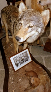 Foto von einem ausgestopften Wolf mit seinem Welpen, ausgestellt im Heimatmuseum Steinegg |