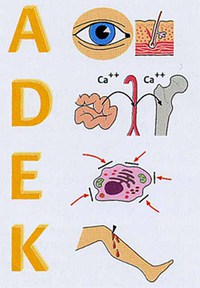 | Zu den fettlöslichen Vitaminen gehören die Vitamine A, Beta-Carotin, D, E und K. Zur Verdauung der fettlöslichen Vitamine braucht es Fett im Pansen. Dieses Fett kann durch fettiges oder ölhaltiges Futtermittel zugeführt werden. (es genügt auch schon Heu) Vitamin A: Das Vitamin A hat die Aufgabe des Schutzes der Schleimhäute vor einer Degeneration. Es ist am Sehvorgang beteiligt. Mangelsymptome können Infektionskrankheiten, Nachtblindheit und Kümmerer sein. Das Vitamin A kommt im Lebertran vor und die Zugabe von Vitamin A ist bei Kalb und Kuh nur zum Teil nötig. Beta-Carotin: Das Betacartin ist eine Vorstufe von Vitamin A. Es ist beim Wiederkäuer für Fruchtbarkeit notwendig. Mangelsymptome können schlechte Konzeptionsraten sein. Das Beta-Carotin kommt in grünen Pflanzen, Trockengras und Grünfuttersilage vor. Beim Schwein und beim Kalb ist eine Zugabe notwendig, bei der Kuh nur zum Teil. Vitamin D: Hat die Aufgabe von der Rgulation des Ca- und P-Stoffwechsels. Es wird von den UV-Strahlen aktiviert. MAngelsymtome die auftreten können sind Rachitis beim Jungtier und Milchfieber. Das Vitamin D kommt hauptsächlich in bodengetrockneten Dürrfutter vor. Dadurch ist beim Schwein und beim Kalb eine Zufütterung notwendig. Vitamin E: Das Vitamin E hat die Schutzfunktion von oxidationsempfindlicher Fette und von fettlösliche Stoffe. Mangelerscheinungen auf Vitamin E sind WEismuskelkrankheit und der Fettverderb wird beschleunigt. Man findet es in Grünfutter, Grünfuttersilage und Getreidekeime dadurch ist eine Zufütterung nur beim Schein notwendig. Vitamin K: Das Vitamin K beineflusst die Blutgerinnung und kann im Pansen aufgebaut werden. Beim Mangel wird die Blutgerinnung herabgesetzt. Das Vitamin K findet man in Grünfutter frisch konserviert und eine Zufütterung ist nicht notwendig. |