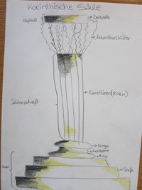 | Die Korinthische Säule Der obere Teil der Säule heißt Kapitell. Er besteht aus der Deckplatte und den Akkanthusblättern. Darunter befindet sich der Säulenschaft. Die Rillen darauf nennt man Kannelüren. Den untersten Teil nennt man Sockel, er besteht aus den Ringen und der Hohlkehle, dies ist die Basis. Unter der Basis befinden sich die Stufen. Quelle: wikipedia Autoren: Sophia Pörnbacher, Theresie Wierer |