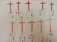 Il cimitero è dietro alla chiesa. Il cimitero è grande e ha molte croci e molti fiori.