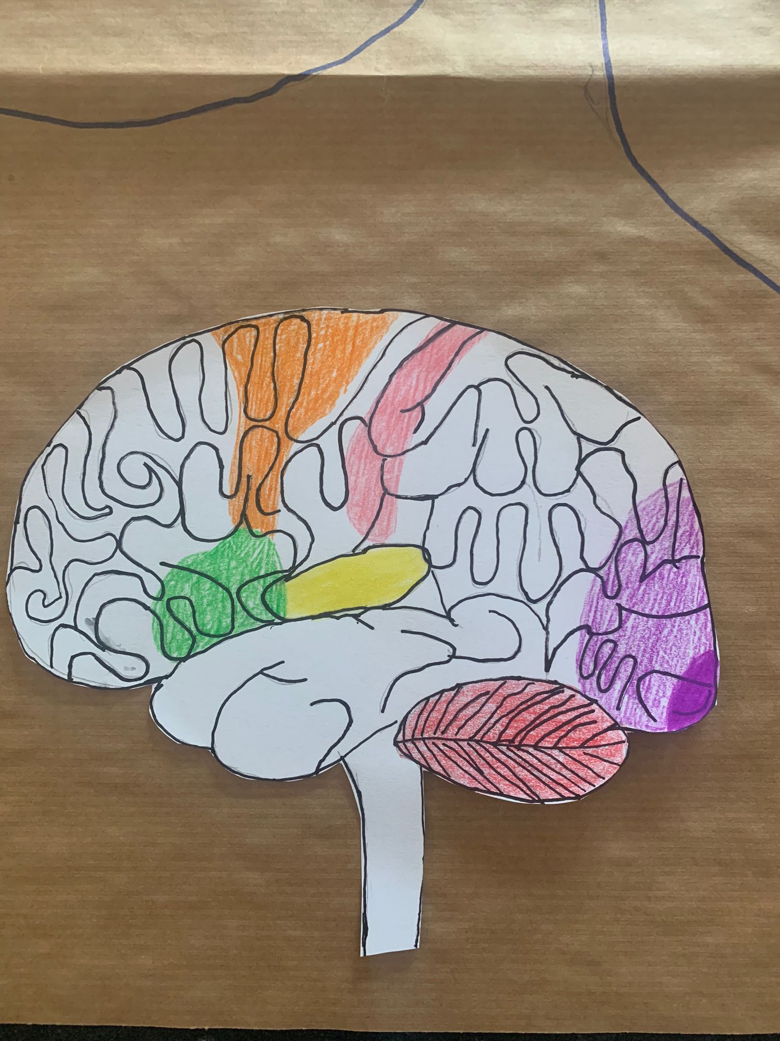 Auf dem Bild erkent man ein Gehirn mit verschiedenen Farben. rot ist der Hirnstamm grün ist das Sprachzentrum orange ist das Motorische Zentrum helllviolet ist Raumorientierung dunkelviolet ist das Sehzentrum gelb ist das Hörzentrum pink ist der Sensorischebereich. |