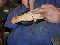 Mit der Falzzange zieht der Schuster das Oberleder über die Brandsohle,
