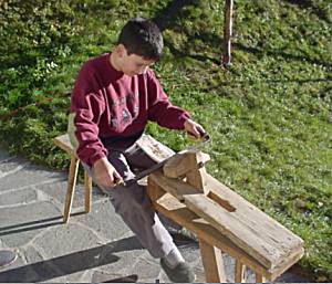 einen Holzschlägel und eine spezielle Bank, an der man die Schindel