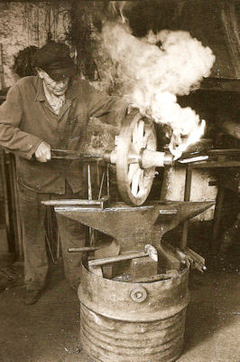 Die Festigkeit bekommt das Rad erst durch das Aufziehen von eisernen Verstärkungsringen und einem eisernen Reifen durch den Schmied. |