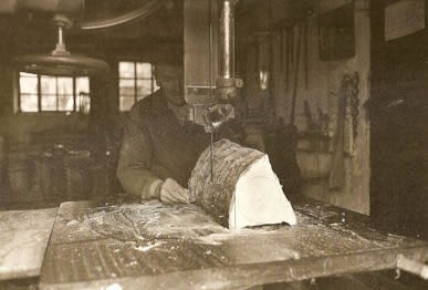 Das Herzstück des Rads ist die Nabe. Der Holzklotz aus Ulmen- oder Eschenholz wird mit der Bandsäge grob zugeschnitten. |